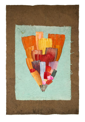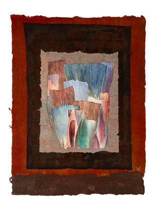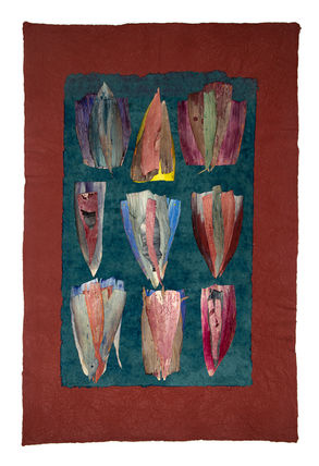 Obras a partir de papeles reciclados hechos a mano, hojas de maíz, pigmentos naturales, hilos de oro y otros materiales, en un profundo y delicado tributo a la mujer, la maternidad y las raíces hispanoamericanas.